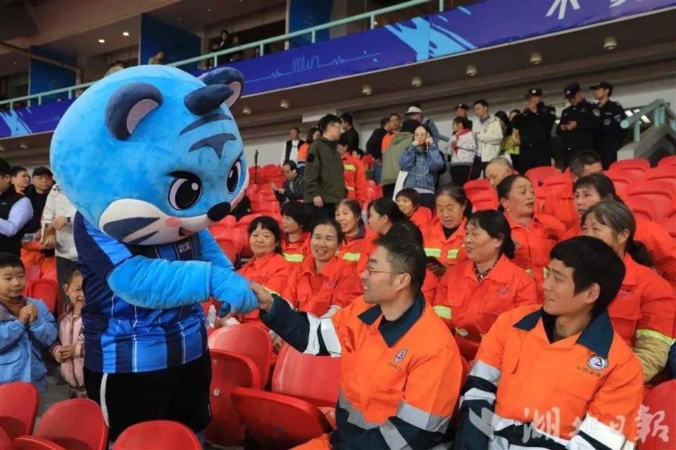 “今晚,有一群特殊嘉宾来到比赛现场,让我们用最热烈的欢呼声,向他们致敬!”10月24日晚,武汉体育中心,2025赛季中超联赛第28轮武汉三镇主场迎战深圳新鹏城的比赛现场看台上,一片明亮的“橙色方阵”格外引人注目——他们是来自武昌区、东西湖区、武汉经开区的200名环卫工人代表。
