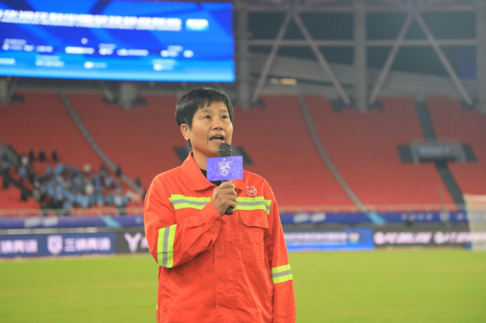本场比赛,首次为武汉足球赛事设置了“国歌领唱”环节。领唱员是57岁的武昌区城管执法局大桥清洁队党支部书记、负责人李红梅。她在环卫一线工作了35年,曾荣获“湖北省五一劳动奖章”“湖北省先进工作者”等多项荣誉。“我也是老球迷了,98年那会儿就爱看武汉队的比赛。”李红梅在休息区聊起足球,眼中闪着光,“今天能作为环卫代表领唱国歌,我很荣幸,这是我们全体环卫工人共同的荣誉。”